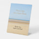 Signez notre Guest Book Beach Wedding Pedestal Signet montrant une photo d'une plage de sable s'étendant vers une mer bleue sous un ciel bleu. Veuillez personnaliser les noms du couple, en utilisant le modèle de personnalisation en ligne avant de commander. Un joli guéridon pour inviter les clients à signer votre livre d'or.