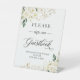 Signez Notre Livre D'Hôtes White Rose Gold Floral Pedestal Sign. La taille par défaut est de 8 x 10 pouces, vous pouvez la changer en d'autres tailles. Pour plus de personnalisation, veuillez utiliser l'outil de design de Zazzle pour modifier ce modèle.