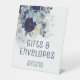 Un bouquet floral marine moderne et élégant et bleu poussiéreux à l'aquarelle avec son ombre doucement débordant sur cette enveloppe Cadeaux et Enveloppes signe de table avec des éclaboussures et des éléments d'or brillants, avec vos prénoms et la date en dessous dans une police moderne.