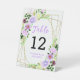 This beautiful and elegant wedding table number sign features watercolor purple flowers and foliage on a gold geometric frame. The text combines handwritten script and serif fonts for a stylish and modern look. This is perfect for a spring rustic wedding.