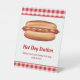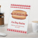Conçu pour les fêtes qui disposent d'un bar à hot-dogs / station de hot-dogs DIY qui permet aux invités de composer leur propre hot-dog avec les garnitures et les condiments de leur choix. Le design présente l'illustration de fast-food de Destei représentant un pain à hot-dog avec une saucisse grillée surmontée de ketchup et de moutarde. La couleur de fond principale est le blanc tandis que le haut et le bas présentent un motif gingham rouge. Il y a également deux zones de texte personnalisables en police de couleur rouge.