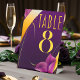 Larger than the standard 3 by 5 inch table cards, our pedestal style table numbers are available in various taller sizes, allowing you to adjust the size to fit your seating arrangement perfectly. The graceful calligraphy script and the striking contrast between the rich purple and the golden elements make these table numbers a stunning addition to your reception tables.