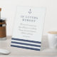 Conçu pour s'adapter à notre collection de mariages Nautical Mix, cet élégant panneau de style côtier est parfait pour placer des photos près des trésors ou une exposition commémorative. Personnalisez les champs de l'en-tête et du corps (illustrés par "dans la mémoire aimante" et un bref poème), ornés d'un trio de bandes bleu marine nautique et d'une ancre en haut.