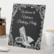 Panneau de bienvenue pour fête d'anniversaire de femme noir et argent avec de belles chaussures à talons hauts argentées sur un fond de couleur à choisir. Ce beau panneau de bienvenue avec chaussure à talon noir et argent est facilement personnalisable avec le texte de votre choix. Vous pouvez changer la couleur du fond et déplacer et redimensionner les chaussures et le cadre selon vos besoins.