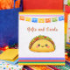 Adorable “Taco ’Bout a Baby” fiesta baby shower design featuring cute kawaii taco with colorful serape accents. Perfect for a fun Mexican-themed celebration.