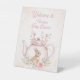 Théière de lapin et panneau de piédestal Bienvenue Baby Shower. Célébrez votre petit avec ce charmant panneau de lapin aquarelle. Avec un lapin mignon et une théière avec des fleurs roses et de la verdure, ce design est parfait pour les baby showers.