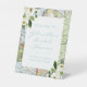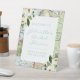 Panneau de bienvenue pour une fête prénuptiale sur le thème du voyage qui tient debout tout seul sur n'importe quelle surface plane, avec un fond de carte vintage bleu et vert et une bordure florale blanche, conçu pour un couple aventurier ou une célébration de mariage à destination.