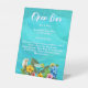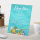 Bachelorette party "open bar" pedestal sign.  Aqua blue "waves" design with a bottom border of specialty cocktails, hibiscus flowers and big leaves.  Text is white with a blue drop shadow.  Use to list alcoholic and non-alchoholic party / shower / reception drinks.  This sign stands on its own and comes in four sizes.  Make sure all text is away from the edges.
