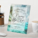 This fun pedestal sign will invite your guests to take a pair of complimentary flip flops so they can dance the night away at your wedding reception. The beautiful design includes elegant script lettering on a watercolor background of a tropical beach with palm trees, pristine sands, and teal, turquoise, or aqua colored water. The sign reads: A little treat for your Dancing Feet. If your feet are tired and sore, slip these on and dance some more! Compliments of the new Mr. & Mrs..." There is a cute clip art graphic of a pair of flip flops or sandals, and space for your names. Wonderful way to add fun and comfort to the celebration of your special day! Perfect for an island or coastal destination wedding.