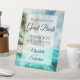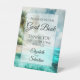 This pretty tabletop sign is designed as and easy way to ask your wedding guests sign your guest book. It features a simple yet elegant design with script lettering on a scenic watercolor background of a tropical beach with palm trees in cool island hues of blue, green, teal, and aqua. The sign reads: Please sign our Guest Book Thank you for celebrating with us! There is room for your names below.