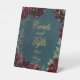 Une tonalité turquoise de bijou bleu "Cartes & Cadeaux", enseigne de piédestal mariage autonome avec symphonie de pivoines rouges framboises bordeaux profondes agrémentée de spray doré et de contours dorés chatoyants se rassemblent autour d'un arrière - plan bleu profond de lavage à l'eau, vos noms et date numérique apparaissent en dessous.
