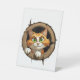 Cette image présente un chat de dessin animé orange aux yeux vert vif et une expression joyeuse et ludique. Le chat regarde à travers un trou rond en bois, montrant un comportement curieux et capricieux. Le cadre en bois est détaillé avec des fissures et des textures, ajoutant une touche de réalisme, tandis que le design général reste dynamique et plein de vie