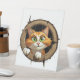 Cette image présente un chat de dessin animé orange aux yeux vert vif et une expression joyeuse et ludique. Le chat regarde à travers un trou rond en bois, montrant un comportement curieux et capricieux. Le cadre en bois est détaillé avec des fissures et des textures, ajoutant une touche de réalisme, tandis que le design général reste dynamique et plein de vie