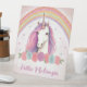 Symbole de table de fête adorable avec une licorne au centre avec une corne colorée, cheveux ondulés, roses et un arc-en-ciel glacé dans le dos. Très mignon et joli. Les couleurs sont rose, bleu, violet, or et vert. Très amusant pour une fête d'anniversaire à thème unicorne !
