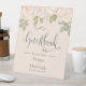 Livre d'or mariage joli panneau de table. avec des fleurs d'aquarelle élégante et moderne, belle calligraphie script avec des fleurs minimalistes romantiques, et feuilles dans des couleurs rose poussiéreuses. Une façon élégante et moderne de décorer vos panneaux de table mariages.