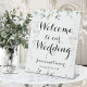 Aquarelle de la végétation eucalyptus le long du haut et du bas, suspendu vignes dans l'arrière - plan avec un script de calligraphie de police swash cursive accueillant les invités à votre mariage avec vos noms et date mariage.