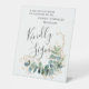 Délicat accent doré (faux or) avec une demi-couronne d'Eucalyptus avec une demande de signer le livre d'or mariage. Portez attention au livre d'or avec ce joli panneau afin que vos invités puissent laisser leurs bonnes pensées et leurs souhaits. Customisez les couleurs de texte à votre mariage de verdure. Des frondes dorées métalliques et des feuillages vert eucalyptus aux lettres grises profondes.