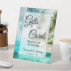 This pretty tabletop sign is designed to make it easy for your wedding guests to know where to leave their gifts and cards. It features a simple yet elegant script lettering on a watercolor background of a tropical beach with palm trees and teal or turquoise ocean water. The sign reads: Gifts and Cards Thank you so much! There is room for your names and the wedding date below.