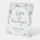 Aquarelle peinte en blanc pivoines et en argent eucalyptus vignes vertes avec un script gris avec vos noms et date mariage conseiller à vos invités où placer leurs cadeaux et enveloppes
