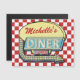Cette oeuvre d'art cool et rétro de les années 50 peut être facilement personnalisée avec votre propre nom. L'arrière - plan est un motif de dames rouge et blanc légèrement en détresse, et le panneau de style années 50 en haut indique DINER et OPEN en néon avec espace pour votre prénom ou votre nom de famille en haut. Le signe comporte également un graphique à flèches. Ce design original sera parfait dans votre cuisine ou dans votre salle à manger - ou pour une soirée à thème les années 50. Il suffit de remplir le modèle facile do-it-yourself. Si vous souhaitez apporter des modifications plus détaillées au texte ou ajuster la taille de la conception sur le produit, cliquez sur "Customiser". Toutes les parties du design peuvent être réaménagées et redimensionnées.