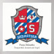 Affiche de lettre S en monogramme de style bouclier de chevalier, idéale pour la chambre ou la salle de jeux d'un garçon dans des tons de rouge, bleu, blanc et gris. Personnalisez avec le nom de votre enfant et la signification de son nom pour un effet personnalisé dans la chambre ou la nurserie de votre enfant, cet exemple est pour le nom Sébastien De Sébastie Respectueux, honnête et loyal. Impression d'affiche idéale comme cadeau pour un nouveau-né, pour un baptême, une cérémonie de nomination ou une fête prénatale. Dessin de bouclier unique, art graphique, recherche de nom, formulation et conception par Sarah Trett. www.sarahtrett.com pour www.mylittleeden.com