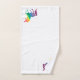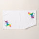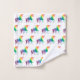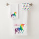 Ensemble de serviette de salle de bains de filles personnalisé par silhouette de licorne d'arc-en-ciel d'aquarelle. Traçages rouges, oranges, jaunes, verts, bleus et pourpres d'aquarelle en silhouette de licorne. Personnalisez avec le nom dans le rose lumineux. La lavette a le motif de licorne d'arc-en-ciel. La serviette de corps a la personnalisation. Arrière - plan blanc. www.SamAnnDesigns.com