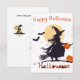 L'image présente la silhouette teintée de violet d'une sorcière marchant à travers un paysage sombre. Elle porte un chapeau pointu classique avec un bandeau orange et transporte une lanterne de Jack-o'-lantern lumineuse. Une autre citrouille sculptée est assise sur le sol à côté d'elle. Derrière la sorcière, une grande pleine lune jaune pâle illumine la scène, mettant en valeur son profil et ses longs cheveux flottants. De petites chauves-souris et des étoiles sont dispersées dans le ciel nocturne. Le texte « Joyueuse Halloween » est écrit dans un script orange ludique en haut, avec un « Halloween » plus grand en bas.