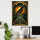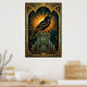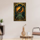 Un corbeau noir saisissant perché sur un piédestal géométrique Art Déco. Caractérisé par des motifs de soleil rayonnants et des accents dorés luxueux. Parfait pour les amateurs de décoration vintage.