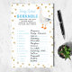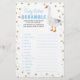 These baby related word scramble game cards are perfect for anyone having a baby shower this year. Simply give these game cards out to your guests to play at the shower, the first person to correctly complete the game will win a prize of your choice. Matching items can be found in the collection. Answers: 1) Diapers 2) Baby Shower 3) Wipes 4) Nursery 5) Blanket 6) Pacifier 7) One-sie 8) Swaddle 9) Activity Mat 10) Teether 11) Bassinet 12) Bottle 13) Rattle
