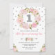 Invitation de premier anniversaire douce et girly avec des fleurs d'aquarelle rose et rousse et des arroses de confettis d'argent.
