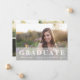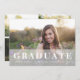 Le faire-part de photo moderne de graduation présente votre photo à fond de fond orienté paysage sur le devant, avec un revêtement blanc pur portant "Graduate" en caractères blancs gras, ainsi que votre nom, l'école et l'année de graduation. Ajoutez trois photos supplémentaires à l'arrière (deux paysages, un portrait) pour présenter tous vos favoris ! Un choix élégant et moderne pour les diplômés 2023.