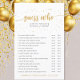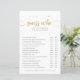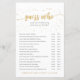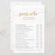 Simple Devinez Qui blanc avec faux or splatters jeu de baby shower. Vous pouvez personnaliser ce jeu avec le nom et la date de douche de l'invité d'honneur ainsi que 15 déclarations/questions. Vos invités de baby shower devineront qui a dit chaque déclaration...maman ou papa.