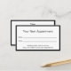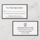 La carte de rendez-vous de ce médecin professionnel est recto verso. Les deux côtés ont une élégante bordure noire. La première partie indique "Votre prochaine nomination" et comporte des lignes pour la date et l'heure du rendez-vous. En bas, il y a le texte d'affichage que vous pouvez modifier pour créer un message personnalisé si vous le souhaitez. (Affichage : Veuillez fournir un préavis de 24 heures si vous ne pouvez pas garder votre rendez-vous.) Une image d'affichage se trouve au-dessus du texte d'affichage sur le côté 2. Vous pouvez remplacer l'image par votre logo. La deuxième partie contient également un texte d'affichage à remplacer par le nom du médecin (ou le nom du médecin), l'adresse et le numéro de téléphone. Tout le texte peut être modifié ou supprimé. Le texte est noir.