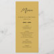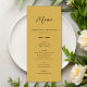 Cette carte de menu mariage de automne moderne et minimaliste propose un agencement simple et propre sur un arrière - plan doré. Le design vous offre de l'espace pour ajouter vos menus de réception de mariage avec les noms de la mariée et du marié et leur date de mariage.
