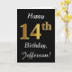 Ce simple design de carte d'anniversaire comporte le message "Joyeux 14ème anniversaire", avec le "14ème" ayant une apparence fausse or. Il comporte également un nom customisé et un arrière - plan noir. Il pourrait être donné à quelqu'un qui célèbre son quatorzième anniversaire.