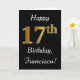 Ce simple design de carte d'anniversaire comporte le message "Joyeux 17ème anniversaire", avec le "17ème" ayant une apparence fausse or. Il comporte également un nom customisé et un arrière - plan noir. Cela pourrait être donné à quelqu'un qui célèbre son dix-septième anniversaire.