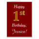 Ce simple design de carte d'anniversaire comporte le message "Joyeux 1er anniversaire", avec le "1er" ayant une apparence fausse or. Il comporte également un nom personnalisé et un arrière - plan rouge foncé. On pourrait le donner à quelqu'un qui célèbre son premier anniversaire.