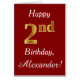 Ce simple design de carte d'anniversaire comporte le message "Joyeux 2e anniversaire", avec le "2e" ayant une apparence fausse or. Il comporte également un nom personnalisé et un arrière - plan rouge foncé. On pourrait le donner à quelqu'un qui célèbre son deuxième anniversaire.