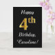 Ce simple design de carte d'anniversaire comporte le message "Joyeux 4ème anniversaire", avec le "4ème" ayant une apparence fausse or. Il est également doté d'un nom personnalisé et d'un arrière - plan noir. On pourrait le donner à quelqu'un qui célèbre son quatrième anniversaire.