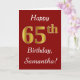 Ce simple design de carte d'anniversaire comporte le message "Joyeux 65ème anniversaire", avec le "65ème" ayant une apparence fausse or. Il porte également un nom personnalisé et un arrière - plan rouge foncé. Il pourrait être donné à quelqu'un qui célèbre son soixante-cinquième anniversaire.