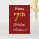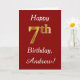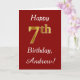 Ce simple design de carte d'anniversaire comporte le message "Happy 7th Birthday", avec le "7th" ayant une apparence fausse or. Il comporte également un nom personnalisé et un arrière - plan rouge foncé. On pourrait le donner à quelqu'un qui célèbre son septième anniversaire.