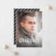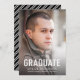 Annoncez votre graduation avec cette simple faire-part de graduation audacieuse avec le mot "Graduate" dans une police sans serif en blanc. La carte a un motif à bandes diagonales contre un arrière - plan noir à l'arrière. Personnalisez-le en remplaçant le texte de l'espace réservé et en remplaçant l'exemple/l'espace réservé par votre propre photo. Pour plus d'options comme changer la police, la taille du texte/la couleur, l'espacement entre les lettres ou pour contracter ou développer le texte courbe cliquez sur le bouton "Personnaliser". *Veuillez noter que le filigrane Zazzle qui apparaît dans l'aperçu du zoom n'apparaîtra PAS sur le produit imprimé final © Rosewood et Citrus