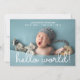 Cette jolie Faire-part de naissance a un design simple avec la photo du nouveau bébé et une calligraphie moderne | script main disant Hello World. Vous pouvez customiser tous les textes, à l'avant comme à l'arrière, et télécharger votre propre photo spéciale.
