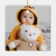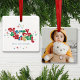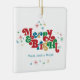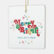 Ces ornements en céramique carré de 2,75" x 2,75" présentent un accueil rétro lumineux et coloré, "Merry & Bright", en rouge, vert, bleu et or avec des espaces réservés pour votre nom de famille et votre année. Ajoutez votre photo préférée au dos !