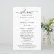 Programme de mariage simple avec un design épuré et minimaliste avec une touche élégante avec le mot "bienvenue" dans le script avec des swashes. Un design moderne noir et blanc qui s'harmonise parfaitement avec n'importe quel style de mariage. Ces programmes de mariage bon marché sont imprimés sur des feuilles de papier pour une option économique.