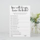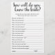 Qui connaît le mieux la future mariée ? Simple "How Well Do You Know the Bride?" garde un jeu de douche de mariée avec un script décontracté et amusant écrit à la main. Le design classique comprend une superposition de typographie de guillemets à lettres modernes. Pour d'autres couleurs ou produits correspondants, veuillez visiter le magasin JustFharryn Zazzle, ou contacter le concepteur, c/o Fharryn@yahoo.com Tous droits réservés. #bohochic #zazzlemade"