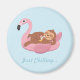 Un aimant avec un paresseux mignon qui se détend avec une boisson fruitée allongé sur un flotteur de flamant rose. La couleur de fond peut être modifiée en mode personnalisation. Le texte indique "Just Chilling". Design fantaisiste, tendance et amusant pour les filles cet été !