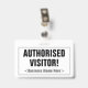 Cette conception de badge simple comporte le message "AUTHORIZED VISITOR!", ainsi qu'un nom de société personnalisable ou un autre message personnalisé. Il dispose également d'une frontière à trois lignes. Un badge comme celui-ci pourrait être utilisé pour indiquer qu'un visiteur ou un invité dans un lieu de travail est autorisé à y être. [~Z0000307]