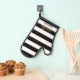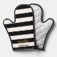 Un faux script d'or (pas de feuille) se trouve au fond du mitt. Vous pouvez modifier le script pour afficher le nom correct. Texte noir qui dit cuisine est sous le nom. Ce texte peut également être modifié si vous le souhaitez. Ce gant à four noir et blanc a un motif rayé.