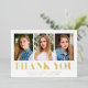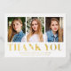 Carte de remerciements de graduation simple avec les 3 photos du diplômé sur le devant avec "Merci" affiché en gras feuille d'or. Personnalisez le carte de remerciements d'obtention du diplôme de feuille d'or en ajoutant le nom du diplômé, le nom de l'école et l'année de fin d'études. Le dos de la carte offre de l'espace pour votre message de remerciement dactylographié ou manuscrit.